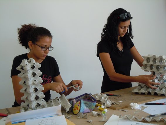 Ça y est, l'année est commencée ! C'était le 1er cours de Volume et le projet de créer un habitat avec les cartons à oeufs. On a 3 pièces et on doit tout utiliser, sans aucun déchet... Ouf ! Pas si simple, disent-ils !